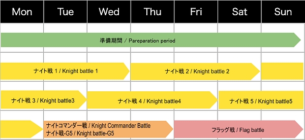 【準備期間】7日 【ナイト戦1】3日 【ナイト戦2】3日 【ナイト戦3】3日 【ナイト戦4】3日 【ナイト戦5】3日 【ナイトコマンダー戦 / ナイト戦-G5】3日 【フラッグ戦】3日